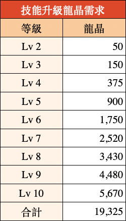 Each skill maxes at Lv. 10. Crystal costs per level: