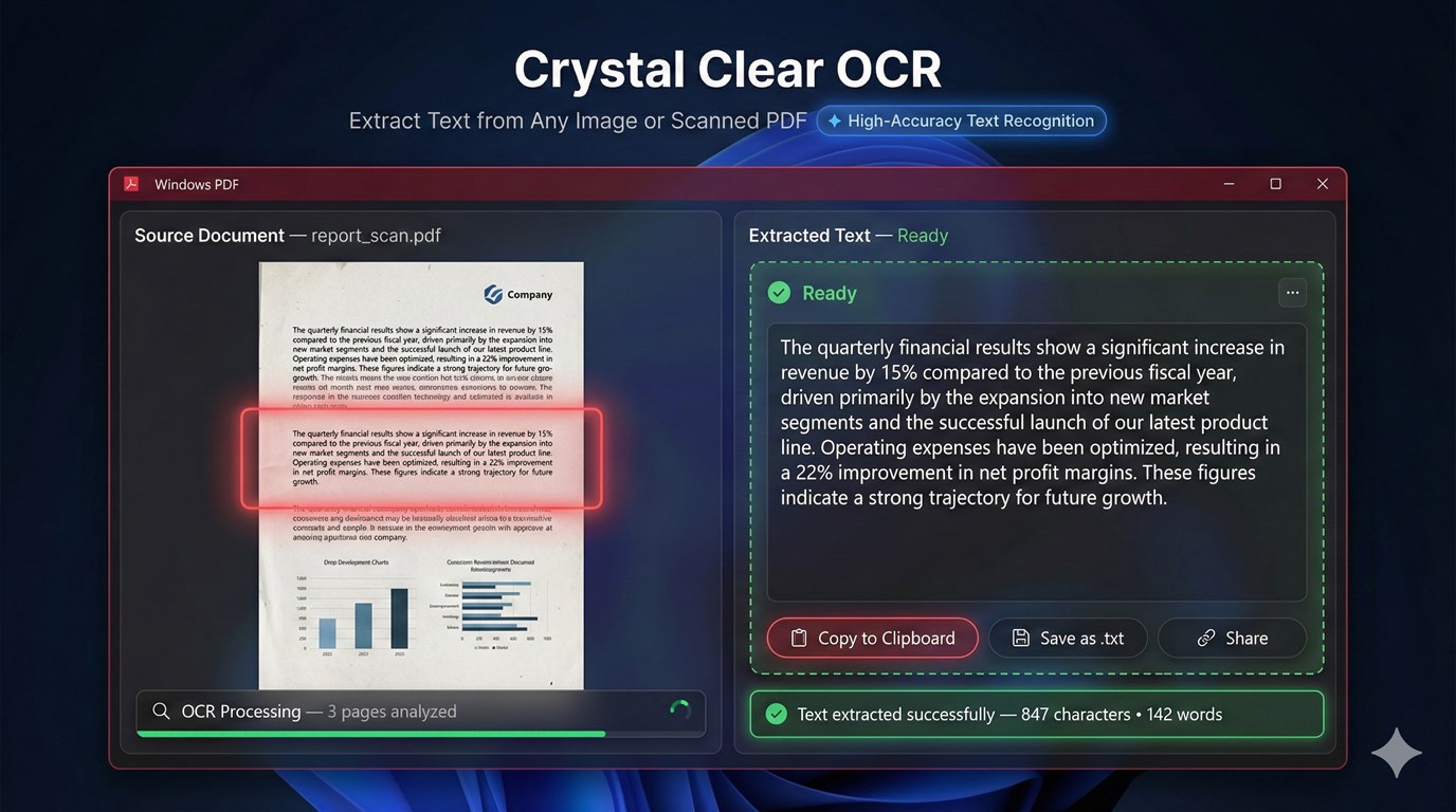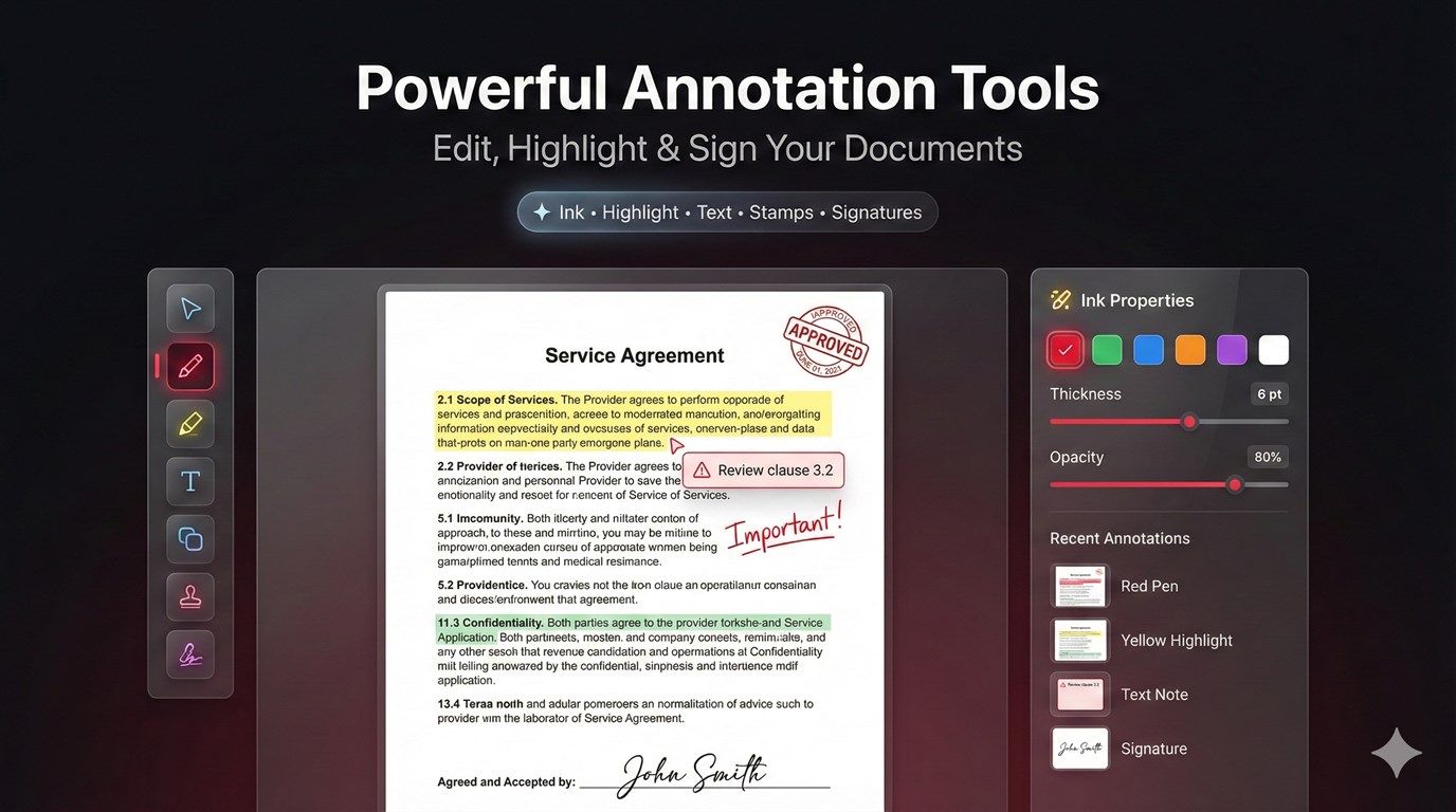 Discover the ultimate PDF toolkit for Windows — one app to view, edit, annotate, merge, sign, and protect your documents. PDF Editor: PDF Reader, PDF Viewer brings everything you need into a single, intuitive app. Open any PDF, add highlights and notes, draw and sign, merge or split files, create PDFs from scratch or from images, and secure them with passwords — all with a clean, modern interface. NOTE Trial & Premium Disclosure: The free version of this app includes daily usage limits on AI-powered features (summarizer, chat, table extraction) and advanced PDF tools (redaction, watermarking). Upgrade to Premium for unlimited access and enhanced productivity tools. View & read PDFs • Open PDFs from your device or drag and drop into the app. • Thumbnail sidebar for quick page jumps. • Zoom and scroll for comfortable reading. • Tabbed interface so you can work with multiple PDFs at once. AI PDF Hub • Summarize long documents in seconds. • Extract tables from PDFs for use in spreadsheets. • Chat with your document — ask questions and get answers from the text. • Simple “How to use” tips and step-by-step guidance built in. Create & combine • Create PDF from a blank document or from images (photos, scans). • Merge multiple PDFs into one; choose specific pages (e.g. 1–3, 5). • Split one PDF into separate files by page range. • Reorder pages with drag-and-drop. Annotate & sign • Draw freehand with pen, highlighter, and shapes; pick colors and thickness. • Add text — comments and notes with your choice of font, size, and color. • Highlight important sections with customizable colors. • Sign documents by drawing, typing, or uploading your signature image. Edit & enhance • Add text and images to any page. • Watermark pages (e.g. DRAFT, CONFIDENTIAL). • Redact sensitive content for privacy. • Extract text from PDFs for reuse elsewhere. Protect & optimize • Add or remove password protection. • Compress PDFs to reduce file size. • QR codes and barcodes — add or read them from your documents. Easy to use • Clear navigation and tooltips so you can start without a manual. • Customize app settings for your workflow. • Save your work with Save or Save As; share edited PDFs easily.