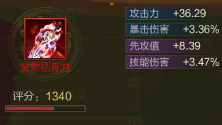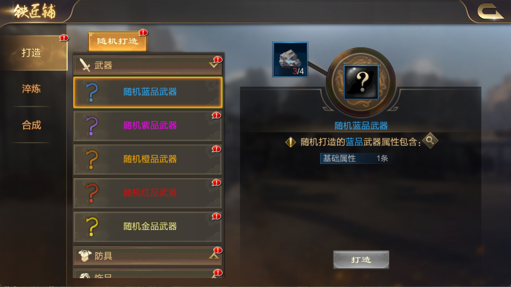 打造任意部位都是随机6选1(除了蓝装),导致每次打造都要同时赌基础属性与随机属性,这无疑增加了出货的难度。有时随机属性爆了输出武将适用的词条,但基础属性却是个攻城值或治疗效果.....行嘛,也能将就用用。