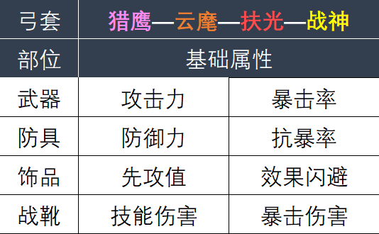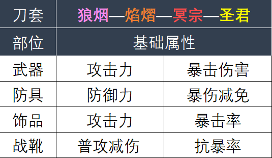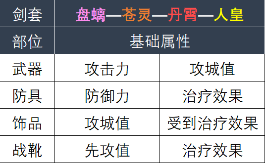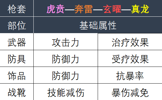 例如枪套武器基础属性是攻击与治疗效果;剑套战靴是先攻值与治疗效果等(蓝品只有1条基础属性),具体信息如下所示: