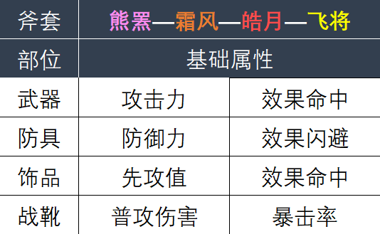根据武器种类的不同,我们可以将装备分为刀/剑/枪/斧/弓五类套装。每个套装都有自己固定的基础属性。