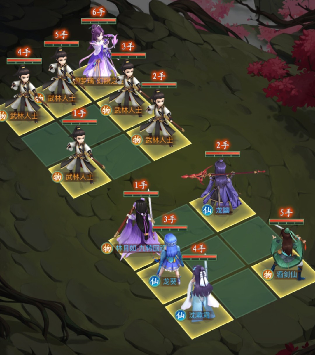 龙葵放4号位(也可以选择姜婉儿):若要保证同列伙伴沈欺霜绝技打到柳梦璃·幻瞑之主身上获取更多分值的情况下,在伙伴龙幽开局就连击的情况下,会消耗敌方柳梦璃·幻瞑之主的1次急救给到右侧武林人士,因此在林月如绝技清理左测武林人士之后,龙葵或姜婉儿可直接清理场上剩余中间武林人士,为沈欺霜绝技打在柳梦璃·幻瞑之主身上创造必要条件。