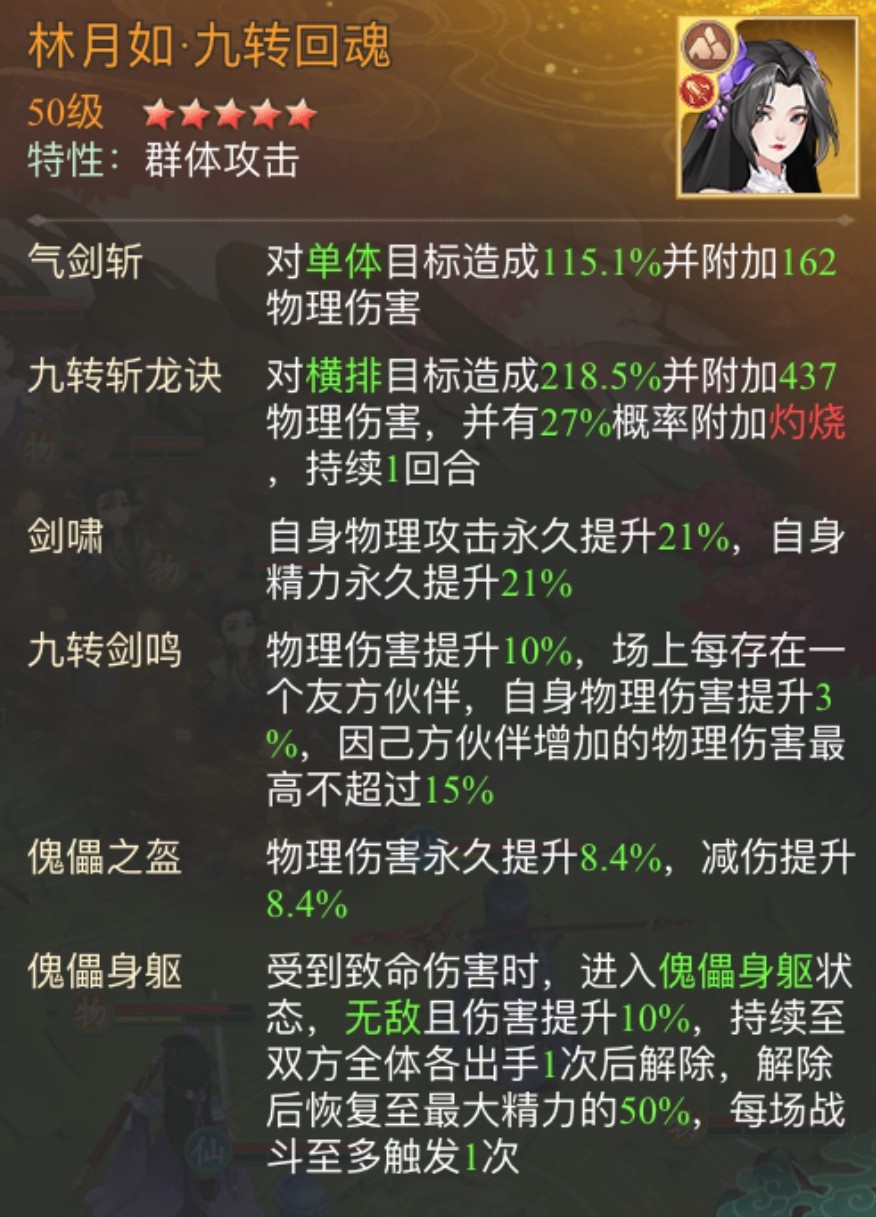 林月如·九转回魂放1号位:本次试炼核心伙伴,该形态下的林月如能抗能打,关键被动“傀儡身躯”受到致命伤害时,进入傀儡身躯状态,无敌1回合,并且增加自身10%伤害,放在1号位在第三回合时,可以完全“吸引”并吸收对面武林人士的绝技“万里追心”对我方精力最少的伙伴进行攻击,在林月如“傀儡身躯”的守护下,我方伙伴直至结束,场上依然可以5人存活,绝技“九转斩龙诀”对横排目标造成伤害,前期在同列伙伴的帮助下,可直接打到敌方最后一排,实现能抗能打的收益最大化。