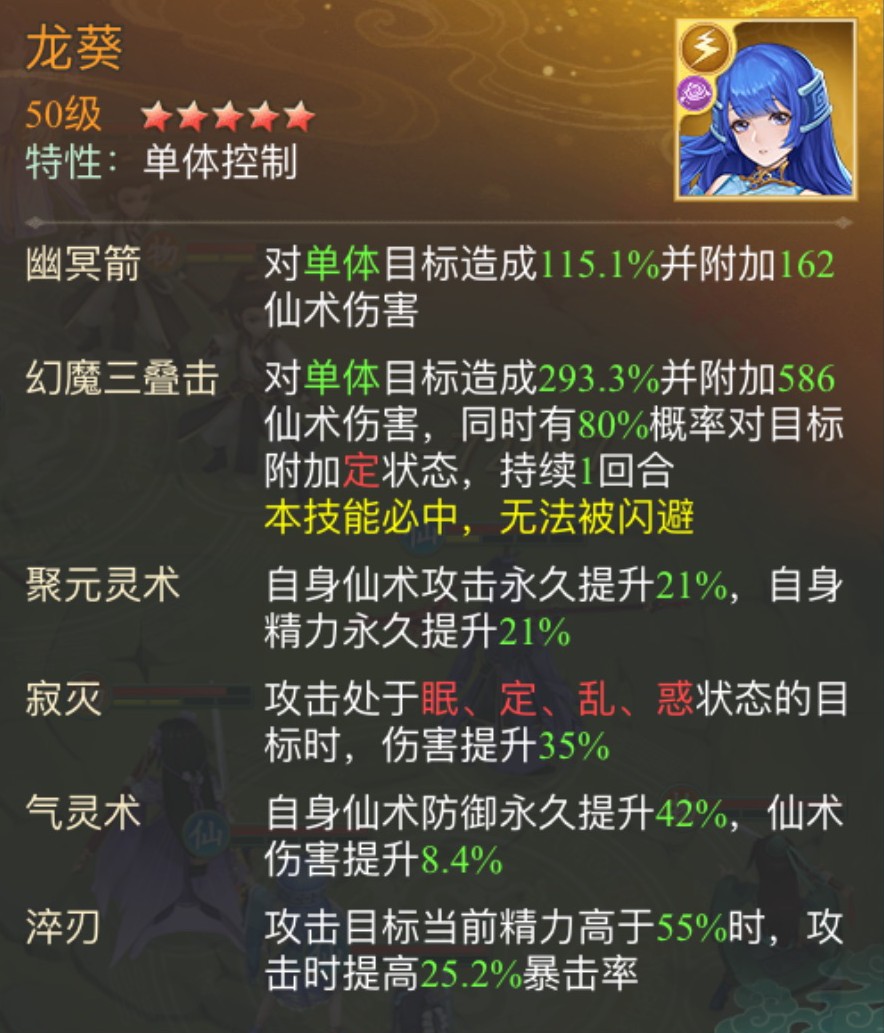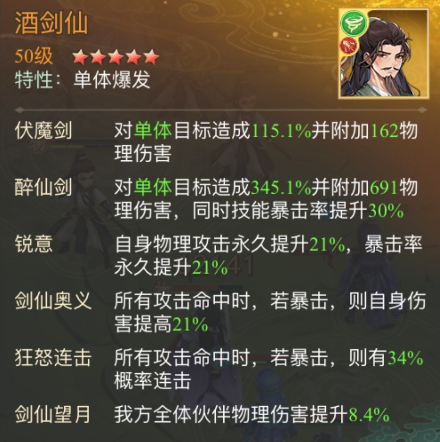 酒剑仙放9号位:开服就陪伴我们至今的老伙计,试炼高分阵容也是有他必选的伙伴之一,被动“剑仙奥义”以及被动“狂怒连击”所有攻击命中时,若暴击,自身伤害提高21%,并有34%概率连击,绝技“醉仙剑”造成高额的单体伤害,因此放在9号位,在同列伙伴龙幽的配合下,绝技可以直接打在柳梦璃·幻瞑之主身上,大大提高总伤害。