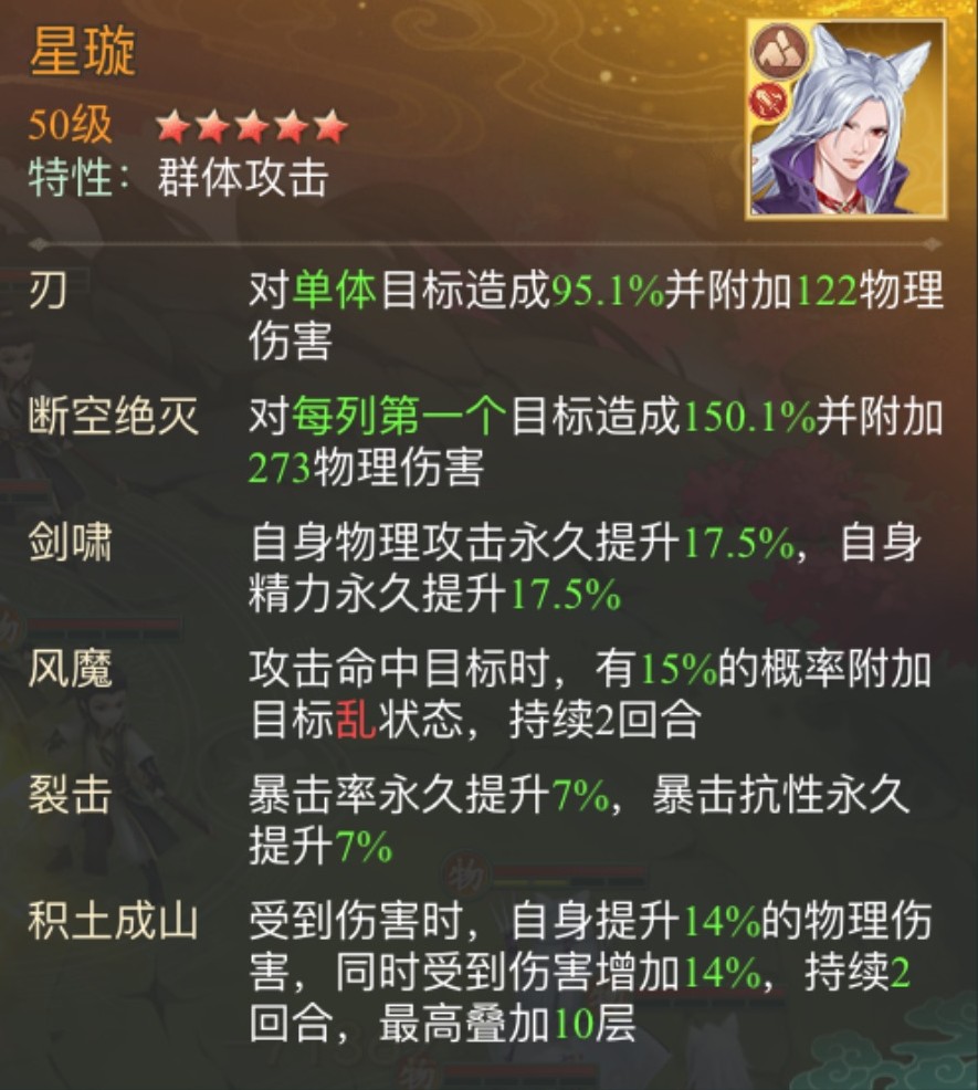 星璇放3号位:每期试炼中也是常常有他的身影,自身被动“风魔”有15%概率对敌方附加异常状态(概率攻击敌我双方),放这里对位右侧最后一个武林人士,本次试炼中主要是依赖其绝技“断空绝灭”攻击敌方每列第一个,若乱到对面武林人士或柳梦璃·幻瞑之主,则有机会成为我们强有力的伙伴,自身绝技还可帮忙清理前排武林人士,便于沈欺霜绝技打到柳梦璃·幻瞑之主身上,增加一定的容错率。