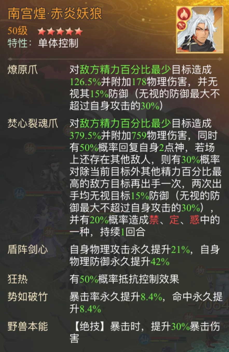 南宫煌·赤炎妖狼放6号位:高分核心伙伴,普攻“燎原爪”对敌方精力百分比最少目标造成伤害,前期(补刀),核心绝技“焚心裂魂爪”同样对敌方精力百分比最少目标造成伤害,重点来啦,绝技有50%概率回复自身2点神,关键2点神可让南宫煌·赤炎妖狼在第五回合时,再开一次绝技,以及场上若存在其他敌人,有30%概率对除当前目标外,场上剩余百分比精力最高的敌方目标在出手一次,(柳梦璃·幻瞑之主精力是最高的)因此会额外对柳梦璃·幻瞑之主造成三段高额伤害,强力增伤被动“野兽本能”绝技暴击时,提升30%暴击伤害,进一步拉高总分值。