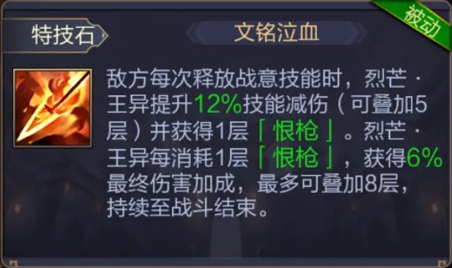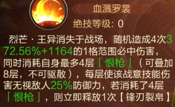 称号拔高了王异的输出上限,且有机会抵挡战意降低效果。绝技额外增加2段伤害,连续命中同一敌人带来的战意加成配合天赋激活后的800点释放门槛可以快速为下一次绝技充能,从而完成循环。消耗的恨枪层数还能使绝技无视部分限伤,让伤害更具穿透。