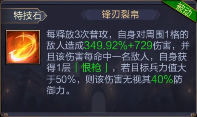 小范围AOE伤害,普攻3次可触发1次。命中多名目标可快速叠加「恨枪」层数来强化绝技释放时的破防能力。低血量目标受到该伤害时亦会被穿透40%的防御,打坦将有天然优势。