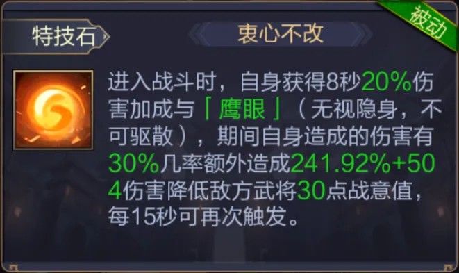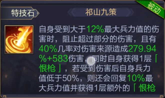 围绕「恨枪」机制强化自身的输出型枪兵武将,星象技强化枪兵兵种的双回复能力,前期适合新区玩家搭配无双诸葛尚过渡,中期转魏国阵容搭无双曹操、无双曹丕&甄姬也很合适。
