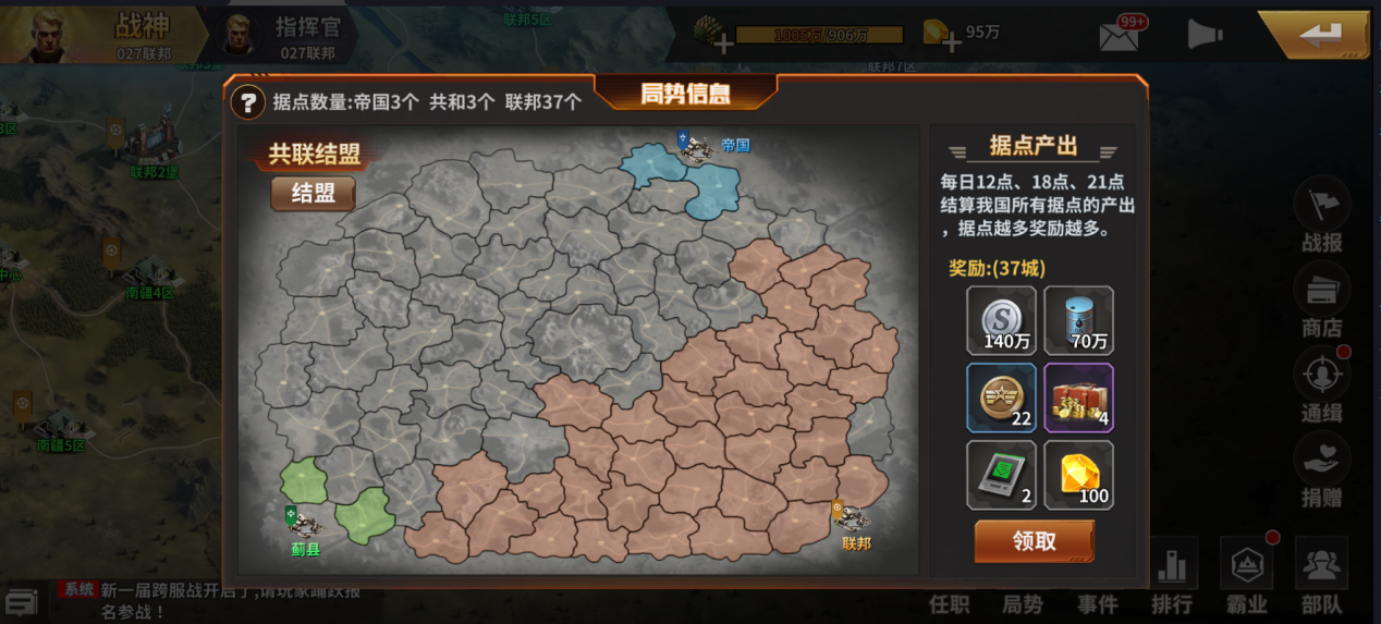 首先介绍一下,王者之师是一款军事策略类游戏,你可以加入共和,帝国,联邦任意一个阵营,在阵营内,你可以和自己阵营的人进行PK,最强第一名可以成为领袖。在国战中,你可以派发部队,去攻城略地,据点越多,我方全员得到的资源也越多。