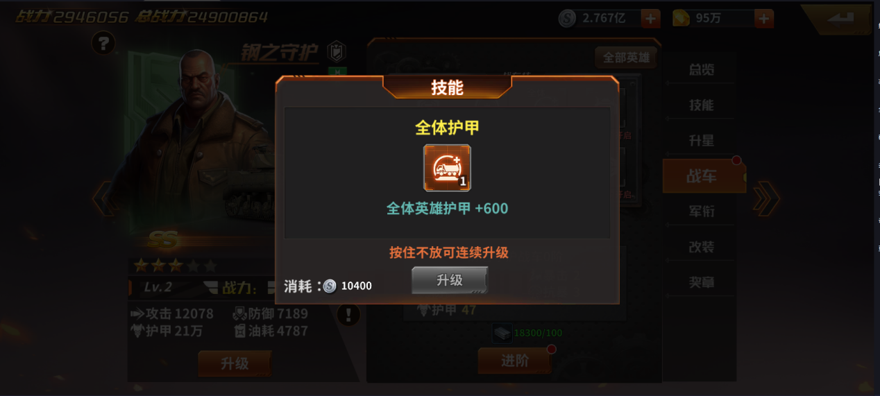 前面升战力,有两个捷径,一个是不断的获得英雄,军力等级升高,从而战力提升。第二个就是升战车,尤其是增加全体属性的战车技能等,其中全体护甲是升战力最多的。
