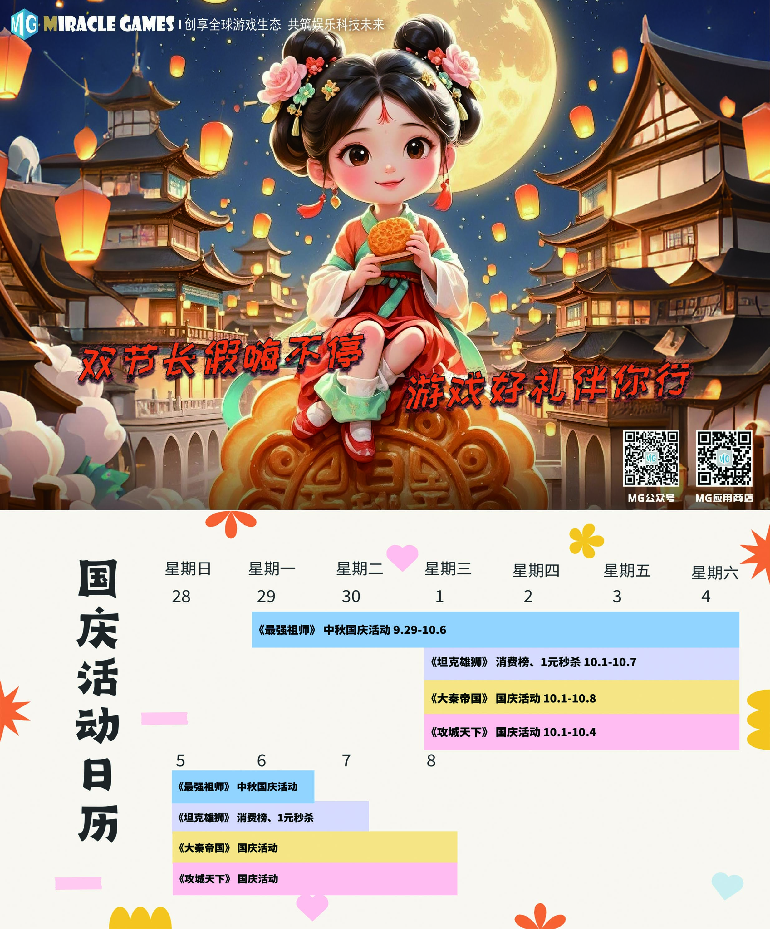 金秋时节,双节同庆!Miracle Games 平台为玩家精心筹备了中秋、国庆游戏活动,《最强祖师》《坦克雄狮》《大秦帝国之帝国烽烟》《攻城天下》四款热门游戏接力上阵,不同时段都有专属精彩等你探索~快跟随这份 “国庆活动日历”,提前锁定假期游戏乐趣!
