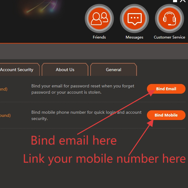In-game instruction: You can bind your email via Settings → Account Center.