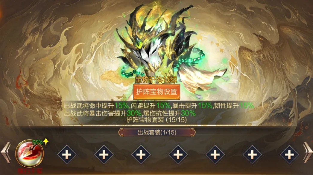 未出战的宝物与珍兽,可以放入到护阵中提升系统的护佑等级,从而获得战斗中的百分比属性加成。