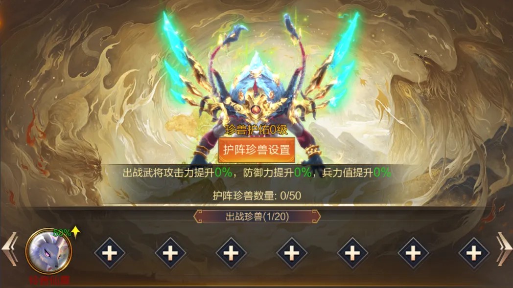 点击界面右上角“法宝守护”和“神兽加护”,可以选择最多15套宝物和最多20只珍兽出战。未放入的不会在战斗中生效,主公需要优先选择强力的宝物和珍兽出战。