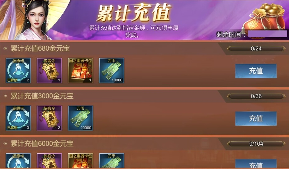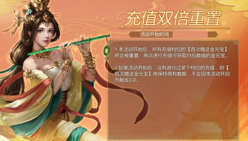 活动介绍:亲爱的玩家,充值双倍福利重置活动来啦!活动开启后,所有充值档位的首次金元宝赠送将重置,充值就能再领一次对应金元宝。但要是活动前没充过某个档位,就不会触发两次哦,快抓住机会充起来!