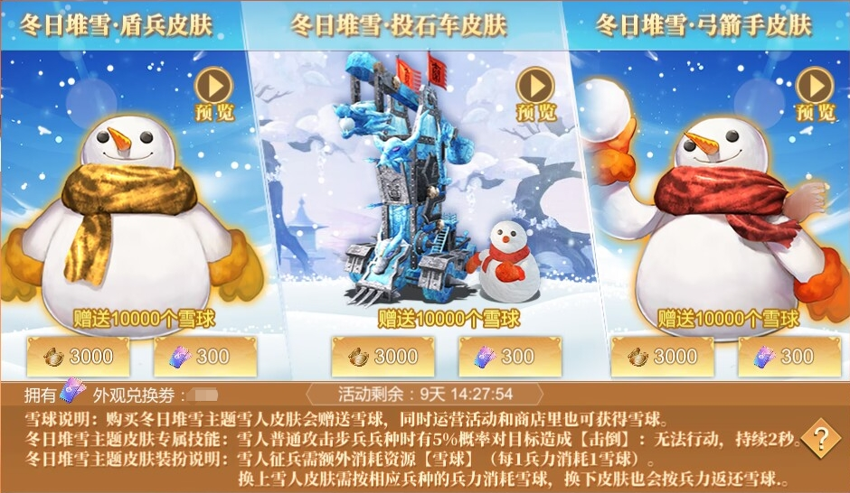 活动介绍:寒冬福利来袭,盾兵、投石车、弓箭手「冬日堆雪」皮肤限时返场啦!雪团裹身的盾兵、缀满积雪的投石车、顶着小雪人的弓箭手,满满冬日氛围感。更关键的是,装备皮肤后攻击敌方有概率触发击倒效果,战力颜值双在线!错过再等一年,速来拿下这套实战派限定皮肤!