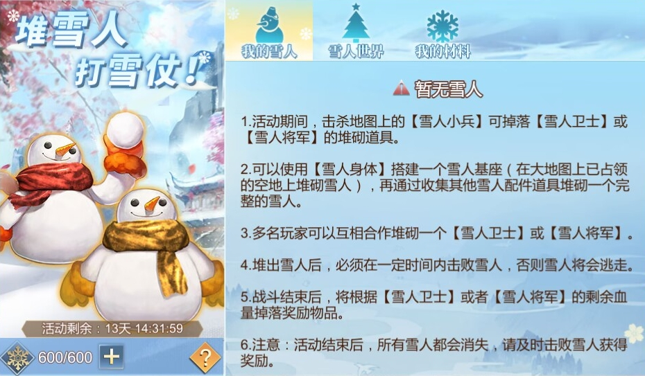 活动介绍:冬日限定活动来啦!击杀雪人小兵掉落道具,搭建雪人基座后和小伙伴合作堆出雪人卫士/将军,击败它们就能掉落丰厚奖励。快叫上朋友一起堆雪人、赢好礼!