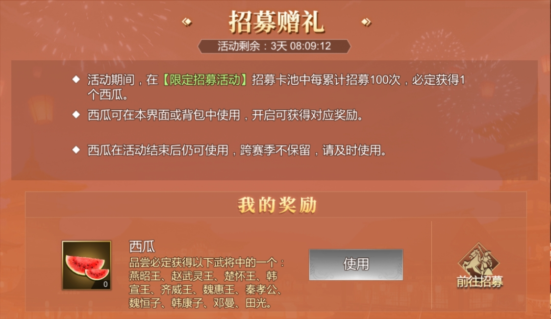 活动介绍:限定招募活动开启!每累计招募 100 次必获 1 个西瓜,开启西瓜可必得燕昭王、赵武灵王等限定武将,还有其他剧本王惊喜掉落。超值福利别错过,快前往招募拿限定武将和剧本王!
