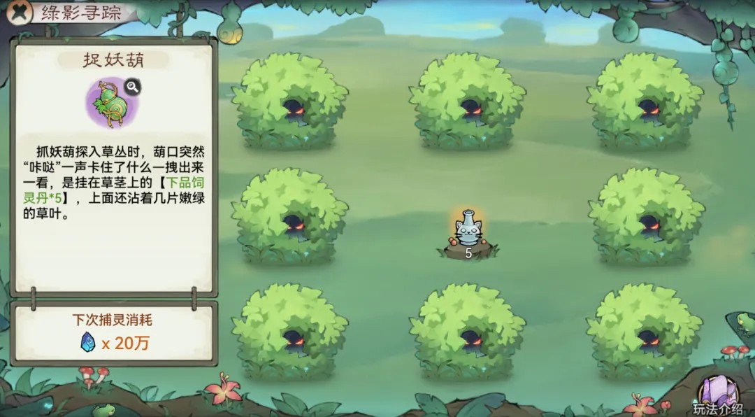 在“绿影寻踪”玩法中,祖师可消耗灵石进行捉妖,选择不同草丛会获得不同的奖励,甚至有机会提升可捉取的灵兽数量和品质;
