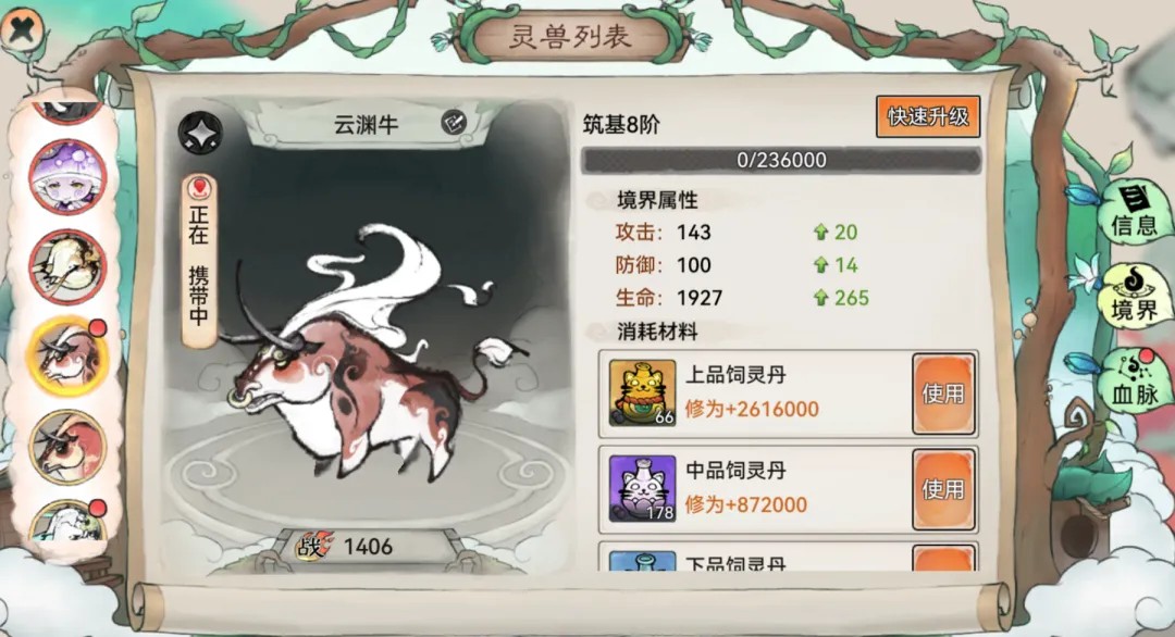 祖师可以给灵兽伙伴投喂饲灵丹来提升其修炼境界,每次到瓶颈时还需消耗一定数量的灵品破障丹来进行境界突破。