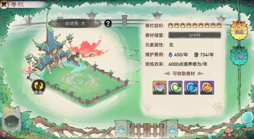 “兽栏”拥有五行属性,灵兽处于自身喜爱的属性环境中,可以额外提升心情值增长效率;