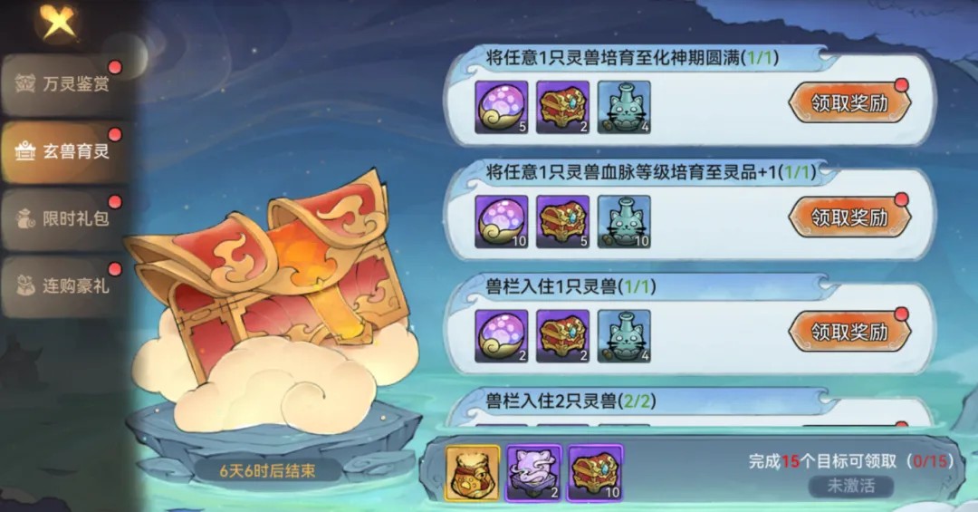 繁衍需要消耗一定数量的太初育灵露和五行精魄,初生的灵兽会有一段时间的成长期,成长期结束之后方可领取。