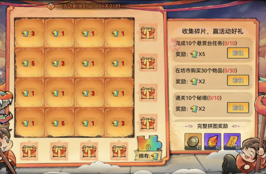 活动期间,祖师完成任务可获得拼图碎片,使用拼图碎片可解锁拼图。