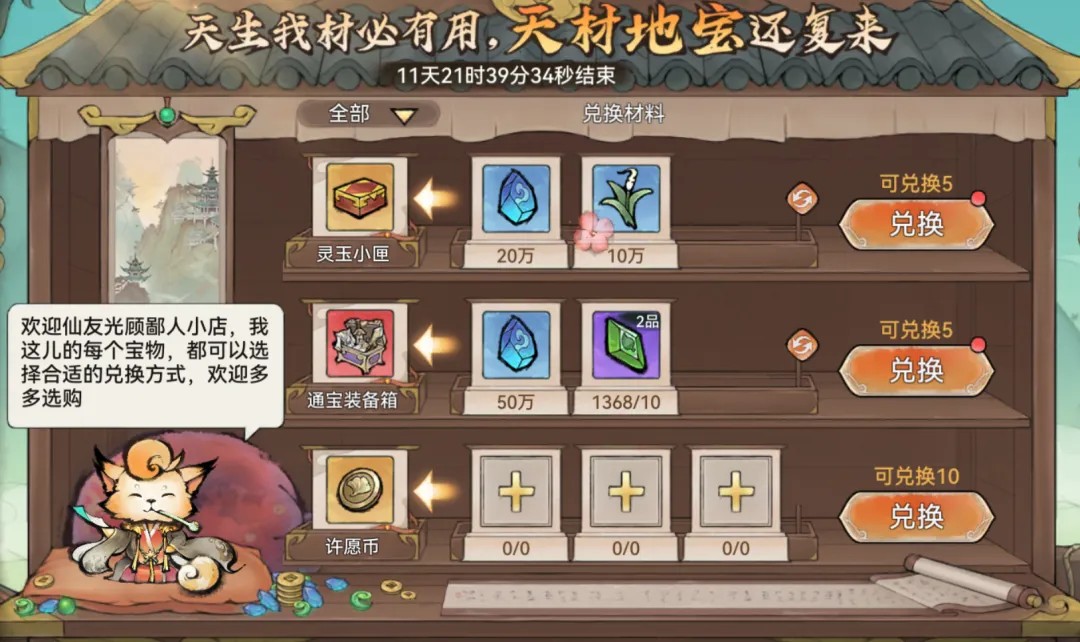 活动期间,通宝仙市会开启,祖师可以选择用不同的材料和灵石限量兑换许愿币、星尘石英、灵玉小匣等奇珍物品。